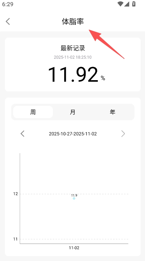 你可以选择体脂率这一指标,查看它的最新记录,以及对应的周、月、年趋势图表,从而掌握该指标的变化情况。