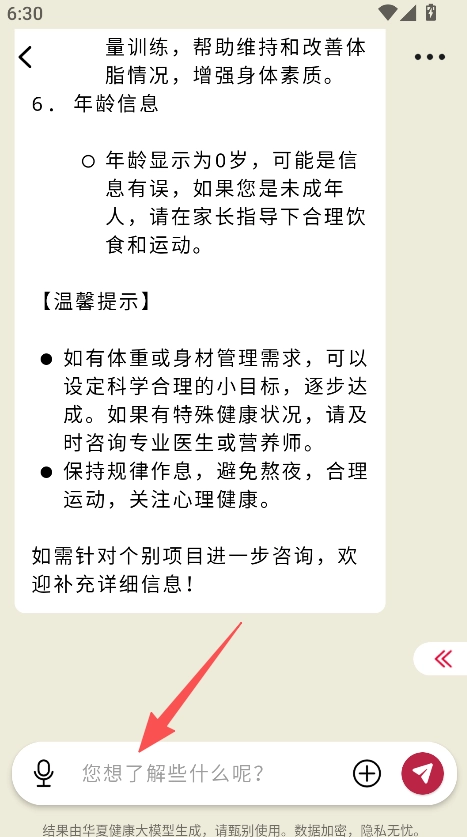 提供健康咨询功能,用户可输入健康疑问,获取体重管理、作息运动等温馨提示及特殊状况的专业建议,助力科学健康管理。