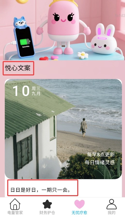 无忧疗愈专区会推送能愉悦心情的文案和舒缓身心的内容,助力用户减轻在等待充电过程中产生的焦虑情绪。