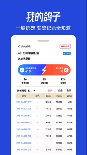 在这里可以查询参赛信鸽的成绩,以便及时了解自己的信鸽是否获奖。