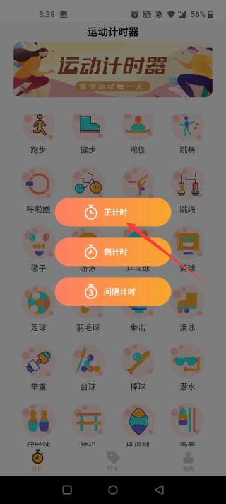 选择相应的运动类型(例如跑步)后,页面会展示正计时、倒计时和间隔计时这几个选项。