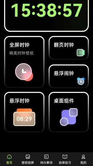 首页清晰展示了全屏时钟、翻页时钟、悬浮闹钟、桌面组件等核心功能模块。