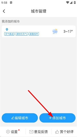 在城市管理界面,点击“+添加城市”按钮,即可跳转至城市添加页面。