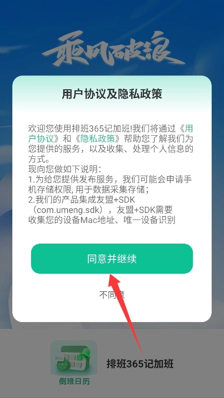 首次使用时,请仔细阅读用户服务协议和隐私政策,确认无误后点击“同意并继续”选项,即可进入应用。