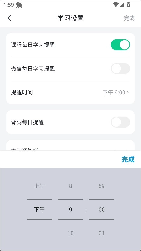 最后按照自己的习惯设置提醒时间,保存后就能开启每日学习提示了。