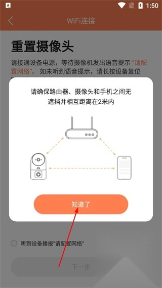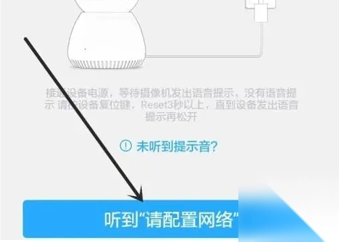 3、点击重置摄像头界面的“知道了”按钮,等待设备发出“请配置网络”的语音提示后,勾选“听到该提示”的选项。