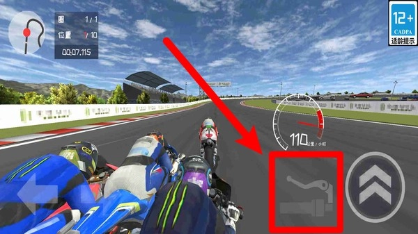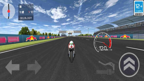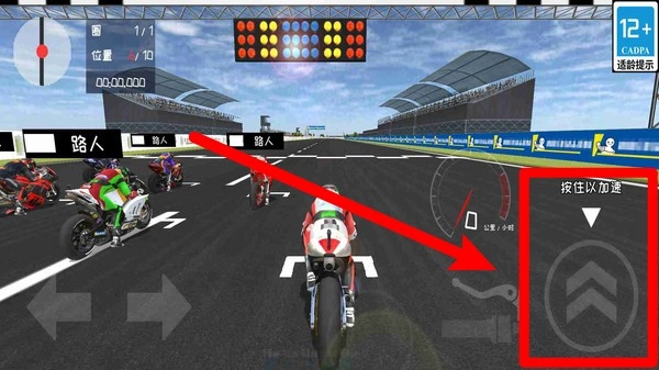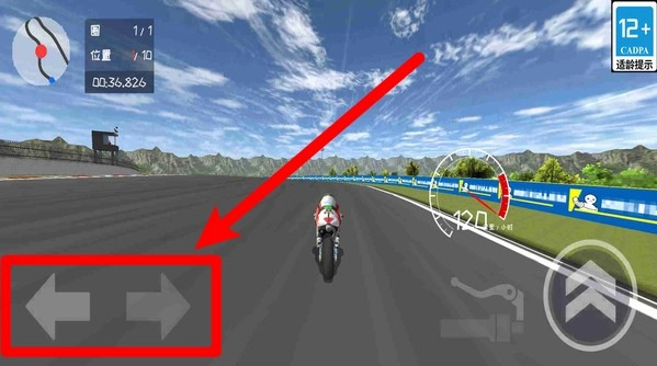 在比赛过程中,玩家借助屏幕左下方的方向箭头来操控摩托车的左右移动,需要精准地进行转向操作,这样才能保证在弯道里维持最佳的速度和稳定的状态。