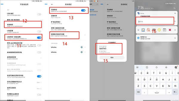 ——开启USB调试(安全设置) ——开启无线调试 ——选择通过配对码进行配对设置 ——在控制栏内输入配对码