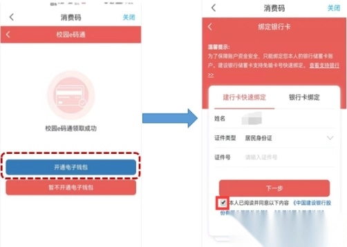 请选择已绑定的银行卡(若尚未绑定银行卡,需前往一卡通中心完成绑定),随后按照步骤开通电子钱包。