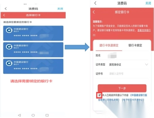 领取消费码(若通过移动端绑定银行卡,可直接用于转账消费;若通过圈存机转账,则需先在一卡通中心绑定建行卡),随后输入一卡通密码(即圈存机转账密码)与姓名,点击验证按钮即可。