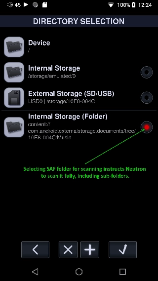 5、这里是外部 SD 中的 /Music 文件夹已添加到 Neutron,您可以选择它进行扫描,也可以点击并浏览其子文件夹并选择它们进行扫描。