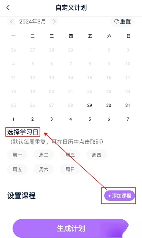 若选择智能定制模式,系统会依据课程直接生成;若选择自定义模式,则需用户先选好日期与学习日,添加完课程后点击生成即可。
