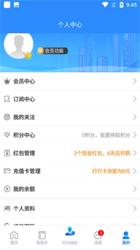 点击“我的”,在这里可以查看我的关注列表、进入积分中心,还能修改个人资料等内容。
