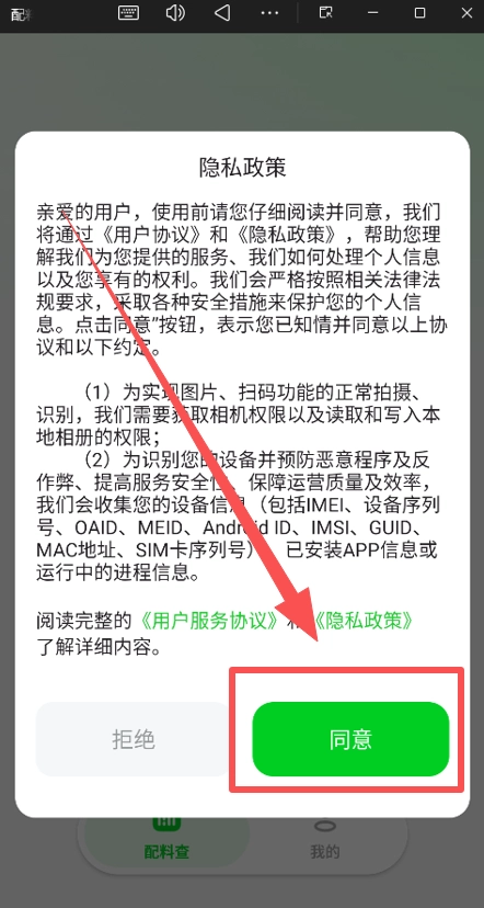 打开应用程序后,首先会弹出《用户协议》与《隐私政策》,必须点击“同意”方可使用。