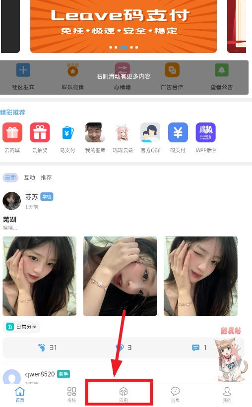 1、首先打开牛马社区,进入首页界面后,找到并点击“应用”选项。