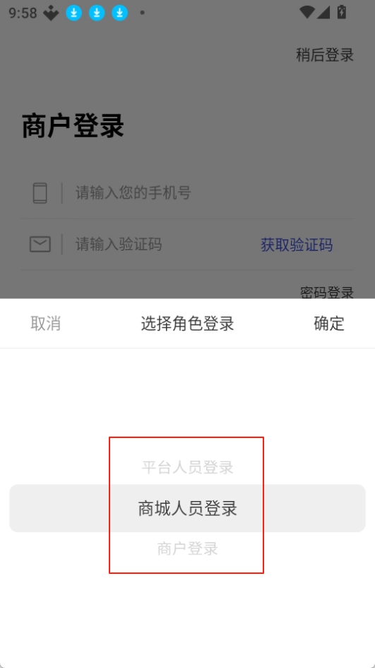 2.系统默认身份为商户,若您是商户,直接输入手机号与验证码就能登录。未注册过的手机号,在登录时将自动完成注册。
