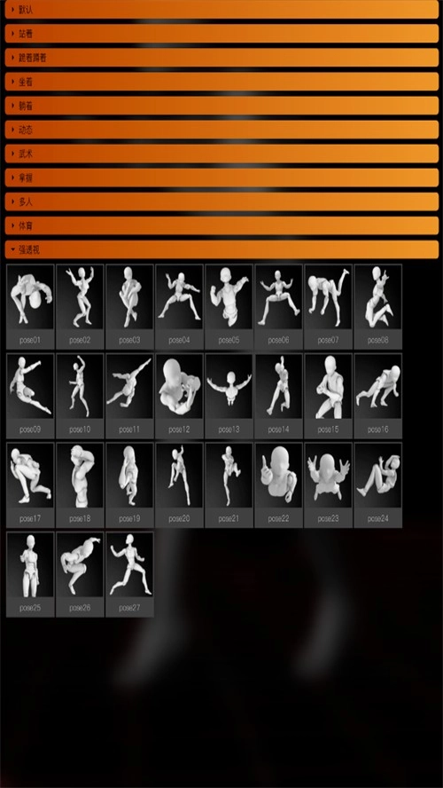 丰富的动作,动画库,通过Pofi云数据库,不定期更新,访问常见的姿势。贴近各类主题,使用简单,不需要熟悉人体结构,就能得到合理的人偶动作姿势。