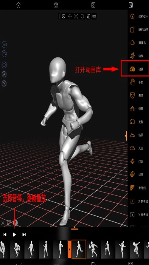 4.同样的,可以选择“动画库”,点击逐帧播放功能,可以对动画进行前进、倒退、逐帧播放。这样可以直接抓取动态动作。