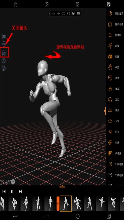 5.每个动画都自带镜头并锁定视图,如果想调整动画角度,可以关闭镜头,旋转视角观看动画了。