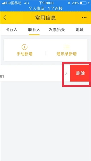 在要删除的乘客条目处向左滑动,点击“删除”按钮,就能删除该乘客的信息。