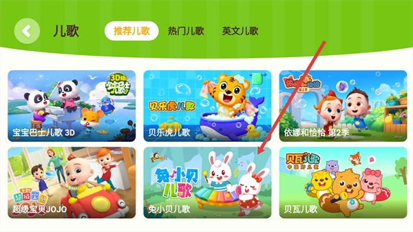 在儿歌板块的推荐内容列表中,点击【兔小贝儿歌】这个选项。