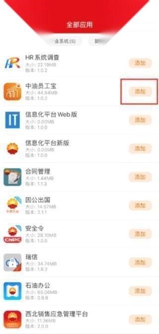 步骤3:在“移动平台”里,进入“应用”分类,找到【中油员工宝】,点击【添加】按钮,然后进行安装操作。