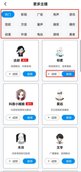 用户能够依据自身需求挑选播报所用的主播声音,还可以先试听一遍,要是觉得合适,直接点击使用就可以了。