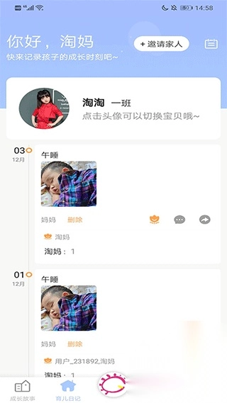 在孩子成长的过程中,家长们可以浏览其他家长分享的动态,还能对这些动态进行点赞、评论以及分享。