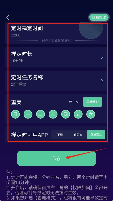 3、设置好禅定时间和时长等,最后点击“保存”。