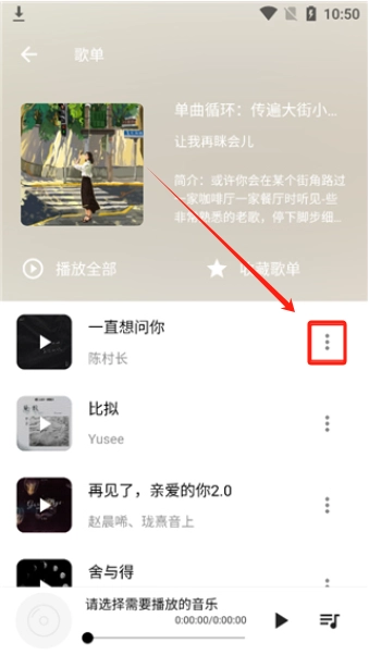 4、进入歌单之后点击歌曲右边的“三个点”;