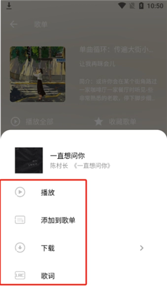 5、弹出的窗口会显示“播放”、“添加到歌单”、“”还能查看“歌词”;