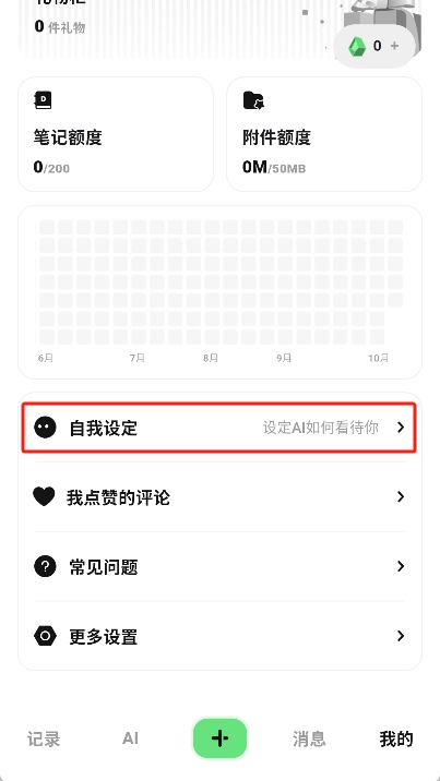 4、在“我的”板块里,你可以找到并选择“自我设定”选项,接着点击右上角的“+”号,输入所需的相关信息,就能创建属于自己的AI角色了。
