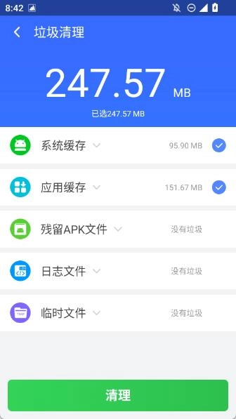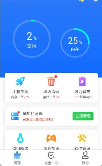 1、界面设计简洁,内存加速、垃圾清理全部都支持;