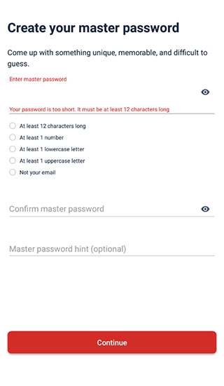 3、之后来到下方界面,按照提示重复输入两次符合要求的密码(至少12个字符、至少1个数字、至少1个大写字母、至少1个小写字母、非我们填写的邮箱地址),并点击continue即可。