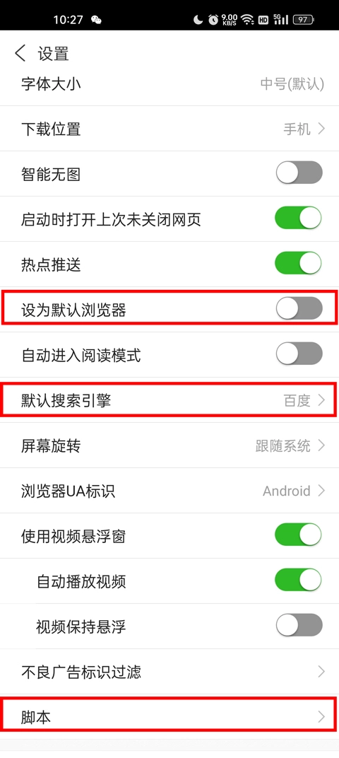 当你需要将其设为默认浏览器、切换搜索引擎或者添加脚本时,都可以进入设置页面进行相关操作。