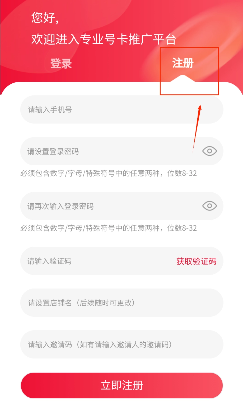 是专注于通讯服务产品推广与管理的移动办公软件,用户可通过推广各类号卡及设备产品获取收益,支持免费领取产品、订单跟踪、数据统计与财务提现等功能,并且可以帮助用户,同时高效开展业务并实时掌握收入情况。注册新账号的步骤很简单:首先打开并进入注册页面,接着输入你的手机号,然后设置一个8到32位的安全密码,最后再输入一次确认密码就可以啦。