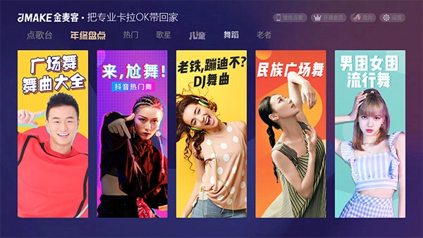 为了紧密贴合大屏用户的使用习惯,金麦客专业K歌的首页面采用瀑布流形式呈现,各类分类清晰直观,能够很好地满足不同用户的使用需求,用户只需通过简单的上下左右操作,就能浏览热门推荐内容。