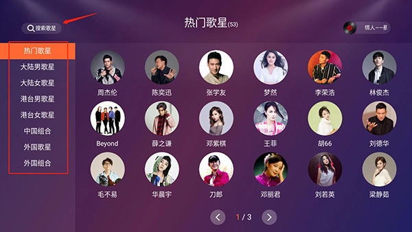 在歌手点歌功能里,你既可以直接搜索歌星名字,也能从推荐的热门歌星、大陆男歌星、大陆女歌星分类中查找歌手,进而挑选他们的歌曲。