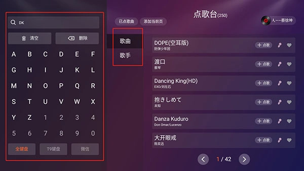 也可以通过歌曲点歌,在搜索栏输入歌曲首字母即可搜索;旁边还能切换为歌手点歌模式,输入歌手名字的首字母就行。