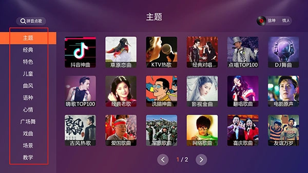 分类点歌指的是依据歌曲的类型来进行点歌操作,像主题类、儿童类、戏曲类等都属于这类歌曲类型。