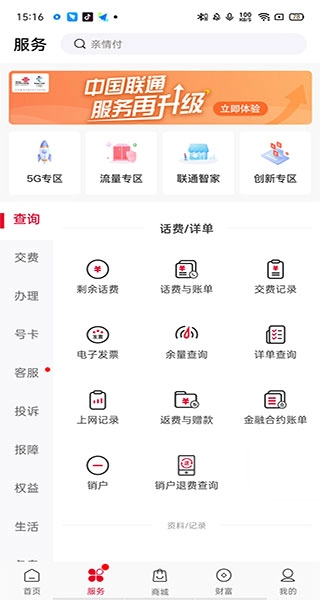查询、缴费、业务办理、号卡服务、客户服务、投诉建议、故障申报、权益保障、生活服务