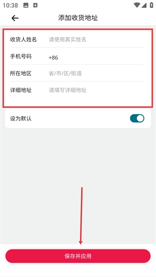 进入【添加收货地址】页面,依次填写【收货人姓名】【手机号码】等相关信息,最后点击【保存并应用】按钮,即可完成收货地址的添加操作。