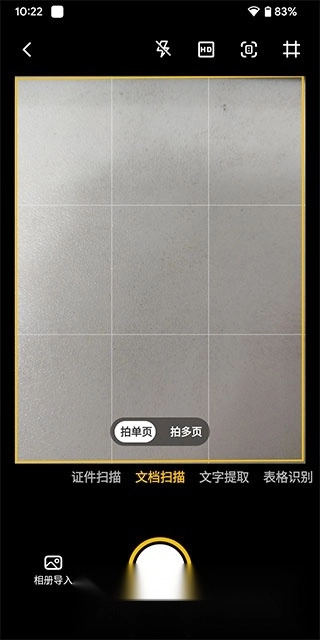 相机界面的顶部设有闪光灯开关、图像像素调节、自动裁剪开关以及网格显示选项,底部则能够切换各类不同的识别模式。