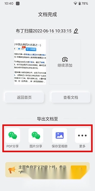 处理完成的文档最终能导出为PDF或图片格式,既可以直接分享到微信,也能保存至手机相册里。