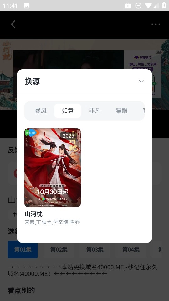 接着随意播放一部自己喜欢的影视资源,这里我以“山河枕”为例,找到播放界面的“换源”按钮。