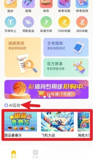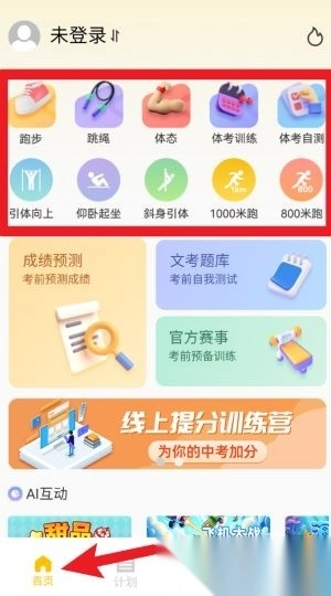 首页顶部设有跑步、跳绳、体态评估、体考专项等多个运动入口,点击即可进入对应的训练板块。