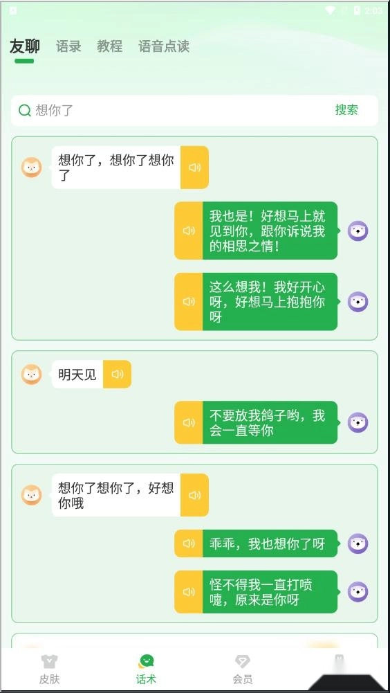 点击话术板块,这里能教你聊天技巧,还提供使用教程、语音点读等实用功能。