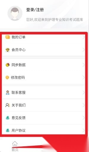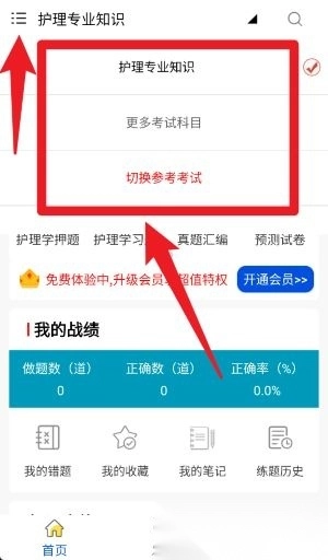 点击左上角的菜单图标,即可展开科目列表,还能切换至其他考试类别,或者返回护理主页。