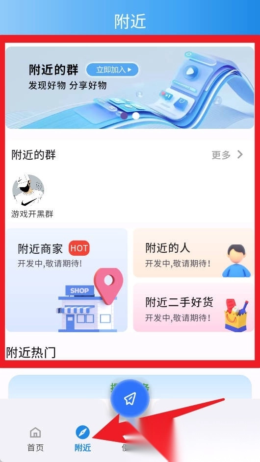 点击底部的“附近”栏目,就能查看并加入周边的群组,还能发现附近的好店、好物以及同城用户。