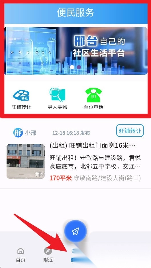 进入“便民”页面后,就能使用旺铺转让、寻人寻物、单位电话等功能,来处理日常遇到的各类问题。